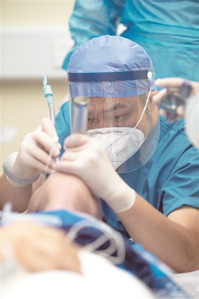 抢救室中央医护工作台后墙的电子钟显示17时7分时,2床患者呼吸出现问题,需要进行气管插管,床边监护仪上呼吸频率显示50,为正常指数的两倍。主治医师周海江、主治医师于涵和护士配合,为患者进行有创机械通气。
