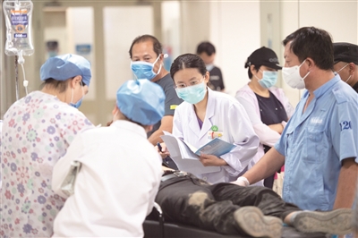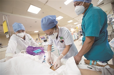 截至17日21时记者离开时,北京朝阳医院急诊医学科抢救室的16张病床上,共收治着11位患者。