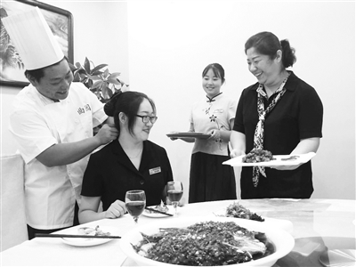 在中国传统节日七夕节来临之际,记者在老字号曲园酒楼看到了温馨的一幕,行政总厨张景严亲自为店里的员工情侣提前送上了“七夕套餐”。曲园酒楼经理马东梅说:“这款七夕套餐中,不但有店里最畅销的茶油剁椒鱼头,还有左宗棠鸡,前者寓意生活红红火火,后者祝福生活甜蜜。”