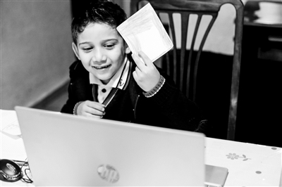 墨西哥学校的2020-2021学年于8月24日开学,受疫情影响,目前课程基本以在线方式进行。图为墨西哥墨西哥州,7岁的塞萨尔·巴斯克斯在电脑前向同学和老师展示自己的绘画作品。