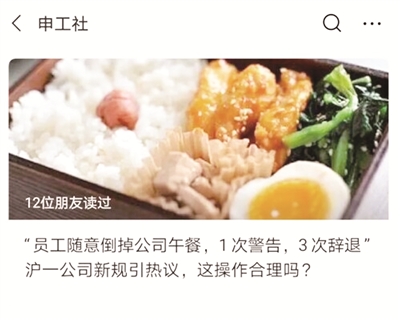 为制止浪费食品行为,最近上海一家公司推出新规,员工如因非变质等原因随意倒掉公司提供的免费午餐(包括倒掉其中部分),一次警告、三次将被辞退。那么,这个规定合理吗?这一信息也迅速引发网友热议。