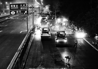 此次大修的四环辅路岳各庄南桥——南沙窝桥北路段位于丰台区,于2000年随主路一并贯通,全长3.16km,联结莲花池西路、大成路、京港澳高速等多条交通干道。自开通以来,此路段作为城市主干路,通行车辆众多,长期处于交通饱和状态。因此,提高四环辅路交通服务水平,需要对破损路段进行大修改造。在进行沥青面层摊铺后,这条工作了20年的老路将以崭新面貌为居民提供安全、便利的通行条件。于佳 摄