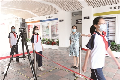 戴好口罩、排成一米线、测量体温……8月31日7时许,文汇中学南校区的学生按照防疫要求,有序排队进入学校。校长杨建介绍,疫情防控常态化下,校园防疫工作继续上学期5月复课的标准不降低,包括校园每天消杀、教室定时通风、学生进校测温等措施,学校也在洗手间等处放置了洗手液等防护用品,通过科学有效的防控措施,确保师生健康和校园安全。