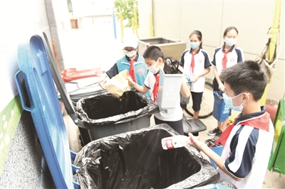 该校有着学生参与校园志愿服务的传统,全校学生几乎人人参与。从新学期起,每天都有近20个学生志愿者上岗,轮流利用课间操、午休等时段监督各班开展垃圾分类的情况;中午吃饭时,部分学生志愿者会来到食堂细检厨余垃圾,挑出其中的包装盒等物,在做好垃圾分类的同时树立珍惜粮食的思想。