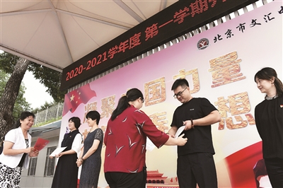 在培新小学开学典礼上,三位学生展示了自己利用矿泉水瓶、卫生纸卷和废旧纸箱等可回收垃圾制作成的多功能笔筒、工艺小灯笼和创意小风扇,呼吁同学们共同加入绿色环保队伍。府学胡同小学优质教育资源带少先队大队展示了假期中同学们设计的光盘行动海报、游戏棋和垃圾重复利用的小视频,倡议同学们在新学期践行垃圾分类、厉行节约号召。
