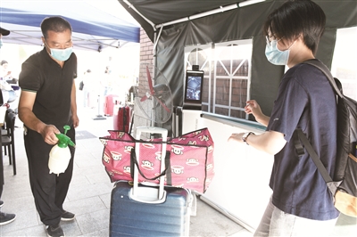红外线测温、扫描“北京健康宝”、行李消毒……9月5日是首师大海淀各校区3200名在校生的返校日,上午9时,拎着大包小包行李的学生陆续回来,他们按照一米线距离排成队,经过上述规定步骤,出示校园卡后进入学校,送学生的家长止步于校门外。因为学校提前进行了分流安排,所以现场井然有序,未出现聚集的情况。