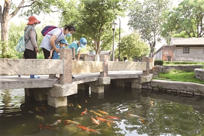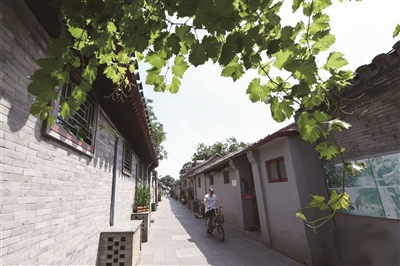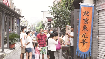 在北京杨梅竹斜街,游客在一家经营传统老北京手工艺品“兔儿爷”的小店参观。