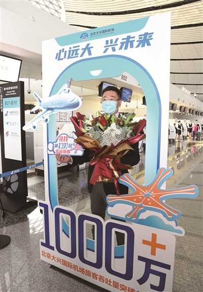 9月22日,在北京大兴国际机场,第1000万名旅客聂先生在合影墙处拍照留念。当日,北京大兴国际机场迎来第1000万名旅客,标志着北京大兴国际机场自投运以来旅客吞吐量首次突破千万人次大关。预计到2020年底,大兴机场投运以来旅客吞吐量将达到1600万人次。 新华社发