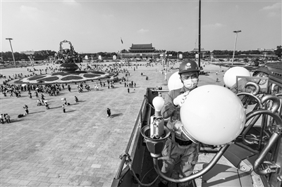 在国庆节即将到来之际,北京市城市照明管理中心华灯班在近一个月时间里,对长安街上253基华灯、6000多盏光源进行全面“体检”,确保华灯干净整洁,达到最佳运行状态。本报记者 邱勇 摄影报道