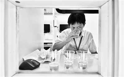 靠品一口酒,能说出这酒是哪口井的井水、哪块地里的高粱酿的——这是电视剧《红高粱》中,高密酿酒师斗酒的一幕。9月28日举行的第二届“北京大工匠”活动酿酒师挑战赛,不亚于民间“斗酒”的难度,白酒组的选手们要通过“闻”“品”,写出这种酒是哪种香型、糖化发酵剂是什么、用什么发酵设备;啤酒组的4名选手要分出几杯啤酒到底添加了什么香味剂、浓度多少,还要通过嗅觉、味觉分辨出啤酒的类型……记者在现场看到,4名白酒组酿酒师、4名啤酒组酿酒师,各个都像是有“神仙舌头”的单家酿酒师罗汉,闻味能定酒的香型,抿一口能定出酒的等级,看酒表面的泡沫能判断酒精浓度。