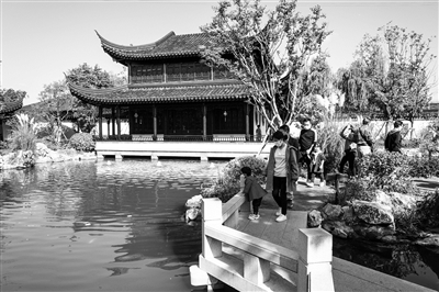 10月8日,旅客在阳澄湖服务区内参观园林景观。当日是国庆长假最后一天,多地铁路、公路迎来客流返程高峰。位于沪宁高速公路苏州段的阳澄湖服务区于2019年5月完成升级改造,通过大型水景等元素还原“诗画江南”意境,成为当地的“新景点”。 新华社发