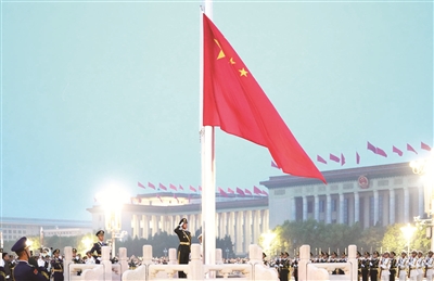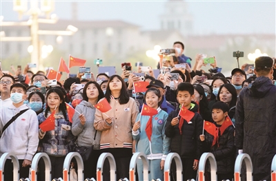 在天安门广场,来自全国各地的各族人民庄严站立,注目鲜艳的五星红旗缓缓升起,表达对伟大祖国的热爱。
