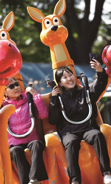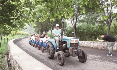 在郊区,三五好友相聚,只见园内满目绿色,泉水叮咚,游人如织,有外地来旅游的,更多的是北京市民趁超长假期携老扶幼休闲度假,人们纷纷驻足留影,孩子们欢快地在亲水区用水枪打水,每射出一注水花他们都得意地喊叫,手舞足蹈。