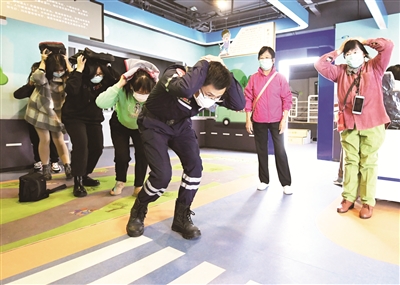 10月13日,在中关村街道安全宣教基地,工作人员指导居民学习地震应急逃生。当日是国际减灾日,海淀区中关村街道东里南社区的居民来到中关村街道安全宣教基地,学习防震减灾知识,提高防灾自救意识。