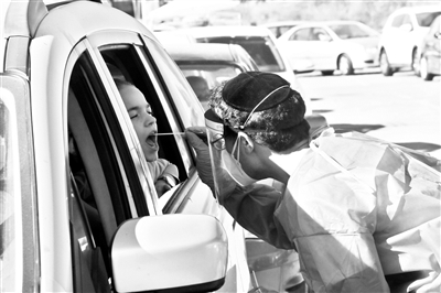 以色列内阁10月13日批准,将原本于14日到期的全国性“封城”措施延长至18日午夜,这是该国第二次宣布延长“封城”。图为在位于以色列中部城市佩塔提克瓦的一处新冠病毒检测站内,医务人员进行取样。