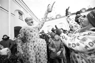 10月17日,俄罗斯圣彼得堡举办首届独立剧院巡游节,共有13个非国立剧院编排了精彩的剧目参加活动。图为俄罗斯“天堂旋转木马”剧团在圣彼得堡街头表演节目。