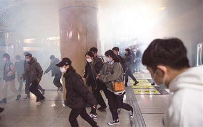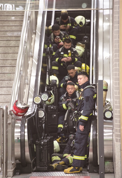 “险情”发生后,地铁站工作人员第一时间实施处置,对人员进行疏散,并启动固定消防设施。消防队伍接警后立即启动救援预案,调集专业力量及社会联动单位到场协同处置。