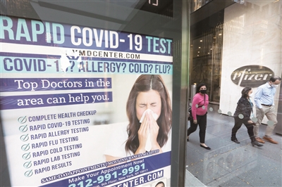 图为11月9日,在美国纽约,人们从一处快速检测新冠病毒的广告旁走过。据新华社