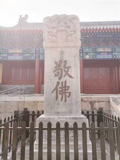 绕过弥勒殿,迎面又是一座大殿,这就是法海寺的主体建筑大雄宝殿。殿前左右为钟鼓楼,两楼对峙,谓之晨钟暮鼓。须弥座下矗立着两通石碑。南侧为“敬佛碑”,正面刻有顺治皇帝御题的“敬佛”二字,背面为“西天东土历代佛祖之图”。据史料记载:清顺治十七年,顺治皇帝下旨在万安山原宏教寺遗址上新建了一座寺庙,取名“敕建万安山法海禅寺”。为了表示虔诚,他特地书写了“敬佛”二字,赐予寺内僧人慧枢。北侧为法海寺“示禁碑”,即顺治十七年皇帝发布的保护寺院、山林的告示。背面刻有“敕赐万安山法海禅寺四至界址:东至山门塔,南至龙泉岭,西至山顶,北至香山”,由此可见当初寺院之宏大。