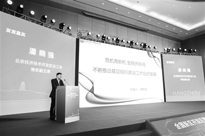 会上,北京经济技术开发区总工会常务副主席潘晓强围绕区域实际分享了在抓紧抓实抓细疫情防控期间推进工会组织建设方面的经验和做法。在疫情防控常态化的新形式下,经开区总工会瞄准“工会组织覆盖率低”这个基层组织建设的薄弱环节,持续强化党建引领,以扩大工会组织覆盖为首要目标和任务,以“抓大带小促中间”为工作思路,以全面建会和规范建会“两步走”为实施路径,在疫情防控、助力复工复产的同时,实现了单独基层工会新增数同比上升、园区工会组织建设创历史新高的双突破。