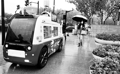 11月26日,一辆无人餐车停靠在上海张江金科路地铁站外人行道上。近日,一种可以远程控制行驶并自主卖餐的移动无人餐车亮相上海张江科学城,为上班族提供快捷的用餐服务。无人餐车装备全方位感应雷达及摄像头,可实现远程操控并兼顾行驶安全。用户在车头前挥挥手,无人餐车就会停车。用户在车身购物屏幕上点选商品,扫描车身上方的二维码,支付取货一次完成。 新华社发