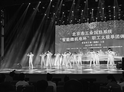本报讯 (记者 马超) 伴随着优美的乐声,职工们开始起式、揽雀尾、单鞭、提手上势、白鹤亮翅……12月1日,北京市工业(国防)工会2020年“智能微机电杯”职工武当太极拳28式团体赛开赛,来自市工业国防系统的14支企业队伍约300人参赛。
