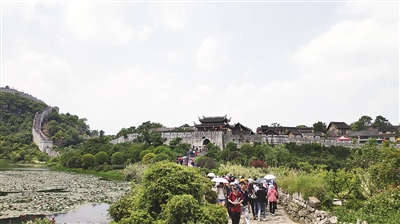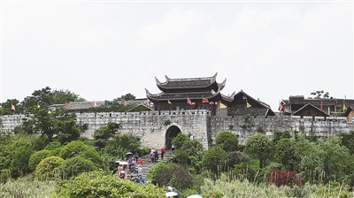 过牌坊30米,登定广门,城南小镇尽收眼底,湖光山色,房屋鳞次,驿道曲折。顺着驿道再往南,依旧是商铺,依旧要爬坡,坡顶依然是古牌坊——周王氏媳妇刘氏节孝坊。