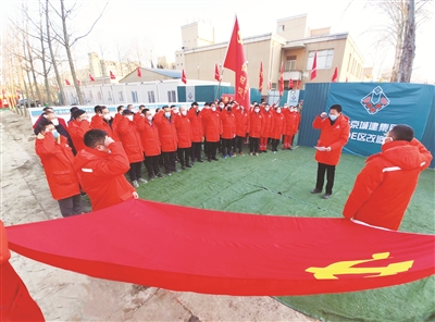 2020年1月29日,在北京小汤山医院紧急改造工程施工现场,53名党员整齐地举起右手,面对鲜红的党旗,重温了入党誓言。领头的就是北京城建集团土木工程总承包部经理、北京城建集团小汤山医院改扩建工程现场总指挥刘奎生。