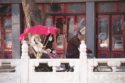 昨天天气晴好。位于北京东城区的什刹海景区艳阳高照,沧桑的古建筑、结冰的湖水、悠闲的游人……呈现一幅别样的古都冬景图。