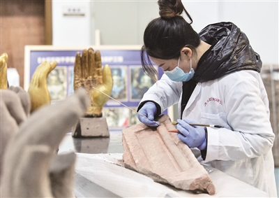 昨日,在大足石刻研究院文物修复室,工作人员在对石质文物进行清理。近年来,重庆大足石刻研究院不断加强对世界遗产大足石刻的保护利用,形成保护、研究、利用三位一体。研究院先后实施了宝顶山千手观音造像抢救性保护和宝顶山“卧佛”治水工程等文物保护修复项目,并重点加强了对遗址群范围内较为分散的中小石窟的保护工作。 新华社发