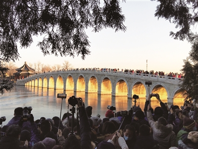 12月20日,北京天气晴好,颐和园十七孔桥上演“金光穿洞”景观,吸引众多游客前来赏景拍照。每年冬至前后,落日光辉穿过颐和园十七孔桥,阳光恰好照射在所有桥洞的侧壁上,呈现出壮丽景观,俗称“金光穿洞”。本报记者 孙妍 摄影报道