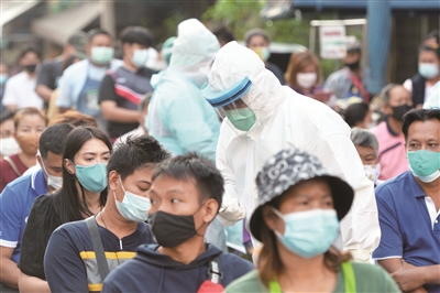 12月22日,泰国沙没沙空府民众排队接受新冠病毒检测。泰国政府按照计划从21日起对沙没沙空府7个社区大约1万人进行新冠病毒感染筛查。近日,沙没沙空府一个大型海鲜市场暴发新冠疫情。