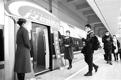 12月24日,乘客准备登上由重庆沙坪坝站开往成都东站的G8608次“复兴号”高铁列车。当日上午9时15分,随着G8608次和G8607次“复兴号”高铁列车分别从重庆沙坪坝站和成都东站驶出,“复兴号CR400AF动车组”首次在成渝地区投入运营,自此两地间的高铁通达时间缩短至62分钟,实现成渝间高铁公交化运营1小时通达。目前,成渝高铁安排每日开行动车87.5对,运营服务将实现产品公交化、购票公交化、乘车公交化、服务公交化。新华社发