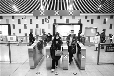 昨天早上8点多,地铁6号线物资学院路站,地铁安检口以及进站闸机旁都有地铁工作人员值守,随时提醒乘客保持安全距离。据了解,北京地铁在持续做好消杀、测温等防控措施基础上,最大程度控制列车满载率。本报记者 周美玉 彭程 摄影报道