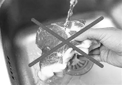 如果用水龙头冲洗生肉,不但不能杀死上面的微生物,四处飞溅的水花还会污染厨房的水槽、案板、料理台、菜刀。正确处理方法是:将清水倒入一个干净的容器,把生肉从包装袋里取出,放进容器内清洗。不要在水龙头下直接冲洗生的肉制品,防止溅洒污染。清洗完生肉,将生肉放到用于加工生食的菜板上。生熟食品应注意使用不同的菜板,以防交叉感染。
