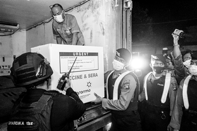 1月5日凌晨,在印度尼西亚巴厘省登巴萨市,人们搬运刚刚运抵的新冠疫苗。自1月4日起,印尼卫生部开始向全国34个省级行政区分发由中国科兴公司研制的新冠疫苗。