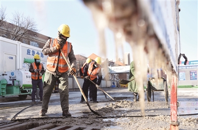 1月6日,受强冷空气影响,天津市出现大风降温天气。根据天津市气象局预报,此次冷空气影响具有风力大、气温低、持续时间长等特点,最低气温或将突破近30年同期极端最低气温。寒潮来袭,在城市的各个角落,不少人依然坚守户外岗位,一个个“敢冻”的身影,保障着城市正常运行。图为中国交建的建筑工人在天津地铁11号线建设工地清理路面积冰。 新华社发