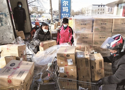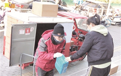 上午10点,零下13摄氏度,西城区宣武门外大街,京东快递员在楼外等候前来取件的客户。一位快递小哥说:“天再冷我也得把快递物品按时送到客户手中,免得他们心里着急。”