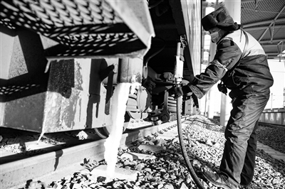 1月6日,中铁兰州局银川站上水工为列车加水。当日,宁夏银川市最低气温达到零下21摄氏度,铁路户外工作者坚守岗位,保障列车运行。