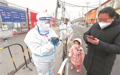 “大家都要注意间隔,别挨的太近。大婶子,把外孙领好了,路面刚消完毒,太滑了,别摔着孩子……”1月14日,午报记者来到顺义区高丽营镇张喜庄,目睹了镇总工会干部下沉抗疫的一幕,镇总工会专职社会工作者王仙正在村里值守。王仙说:“今天是给封闭在村内的村民做第四遍核酸检测的时间,每个环节都得把好关。”