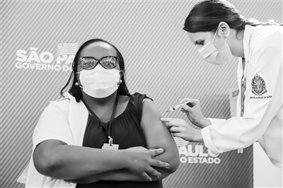 巴西首名新冠疫苗接种者莫妮卡·卡拉桑斯当天下午在圣保罗大学临床医院接种中国疫苗。卡拉桑斯是巴西埃米利奥·里巴斯传染病研究所重症监护室的一名护士,现年54岁,患有糖尿病,属于新冠高风险人群。她在接种后表示,对接种中国疫苗感到高兴。