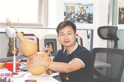 机会总是留给有准备的人。在基层服务期间,廉毅翔结识并拜师非遗“火绘葫芦”技艺第四代传承人牛成果,所掌握的美术专业有了淋漓尽致的发挥平台。之前,牛成果靠着祖传手艺,一直想把火绘葫芦做成顺义地区的文化名片,在了解到廉毅翔的美术功底后,就让他负责火绘葫芦技艺推广项目。自从接触了这门手艺后,他很快爱上这个行业,并暗下决心,要围绕这门非遗技艺做出点动静来。
