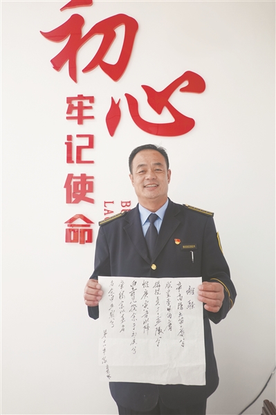 “安全驾驶需要平和的心态,而练习书法正好能让人的心情平静下来。而且我还发现写毛笔字不光能静心,还能减压呢。”肖登明说自己原来脾气不算好,有时也有点儿冲动,自从练了书法之后,同事们都说他越来越有“书香味”了,脾气也更平和了。