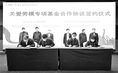 启动仪式上,中国职工发展基金会与中国工人出版社、中国职工国际旅行社总社、中国职工服务(集团)有限责任公司共同签署“关爱劳模专项基金”协议。这是中国职工发展基金会设立的首个专项基金,旨在发挥系统资源优势,开展多种形式的公益行动,探索打造爱心献劳模和劳模献爱心相结合的公益模式,将关心关爱劳模事业推向新的高度。