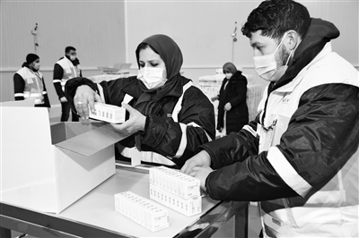 1月27日,在摩洛哥卡萨布兰卡,工作人员整理刚刚运抵的中国新冠疫苗。摩洛哥卫生部27日发布公报说,该国已收到第一批由中国国药集团生产的新冠灭活疫苗。