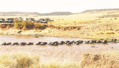 当然,正确说法应该是去看“动物大迁徙”,但是我们说惯了去看“角马过河”。我们都很理解旅行社的难处,角马什么时候过河是不会通知旅行社的。或者今天正巧角马就没有过河,或者我们到的时候,角马刚刚过了河,你说怎么办?我们在马赛马拉只有今天一天时间,能不能看到角马过河,全看我们的运气了。领队安慰我们说:“我带队几年了,每年来一次马赛马拉,回回都遇上角马过河,今天还会遇上的,我就是运气好!”
