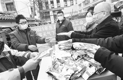 东直门街道总工会相关负责人表示,疫情和严寒天气给职工生产生活带来了不利影响。街道总工会前期摸排了辖区户外工作者情况,根据实际需要为职工送上暖宝宝。工会同时还根据上级要求,督促并协助用人单位制定应对严寒天气的工作方案和应急预案,为户外劳动者提供防寒防护用品和作业休息场所;督促用人单位合理安排和调整作业时间,采取轮换班、轮休等方式;适当增加寒冷作业环境下职工休息时间,降低职工劳动强度;督促用人单位及时足额支付职工工资,为包括农民工在内的广大职工防寒保暖解除后顾之忧。