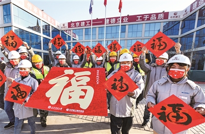 2月3日,北京建工路桥集团留京过年的技术员和工人们展示他们收到的“福”字。当日,由北京市总工会主办的“安全防疫做在前 快快乐乐过大年暨我把祝福寄回家”活动在北京建工路桥集团地铁项目工地举行。活动现场,摄影师为留在京城过年的劳动者拍摄了照片,劳动者们把用自己照片制作的“福卡”以及工会赠送的新春“福包”一起寄给家人,表达思念和祝福。