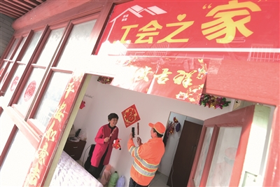 为保障职工安心开工,工会也积极发挥作用。德胜街道保洁队将职工之家临时改为职工探亲房。保洁队员李明春就是受益人之一,他的爱人井维英从山东老家来到北京,陪伴两年没回家的丈夫过了一个京味儿年,这不,老李又精神饱满地上工了。