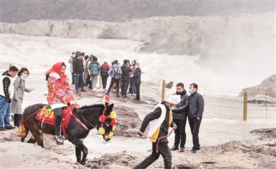 从2月24日起,陕西壶口瀑布景区恢复对外开放。随着气温回升,黄河上游冰雪消融,水量增大,壶口瀑布的主瀑布恢复了往日奔腾咆哮的气势,黄河之水奔腾而下,形成壮观瀑布群。临近元宵佳节,为丰富游客的旅游体验,陕西壶口瀑布景区还准备了猜灯谜、品汤圆、游美景、全时段精彩演出等活动,为远道而来的游客送上节日温暖。图为游人在陕西壶口瀑布景区游览。